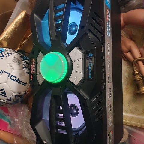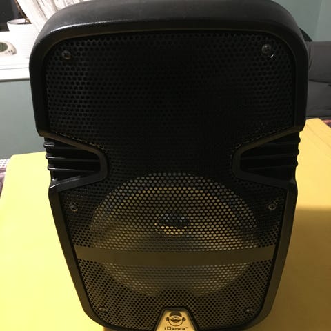 Høyttaler med 2 mikrofoner. Kan kobles til mobilen for å spille av musikk og synge karaoke. Kjøpt i lekebutikk.