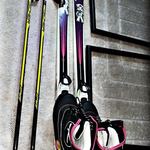 Frost langrennski (120 cm) + staver (95 cm) og frost (alpina) skisko str 28.