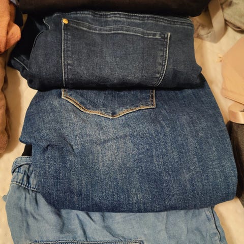 Den ene dongeribuksa har gått litt opp i sømmen mellom buksa og tøyparti på magen. Dette kan nok enkelt sys.