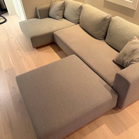 Bolia-sofa med sjeselong og tilhørende puff selges rimelig. Sofaen kan deles i to for enklere frakt.