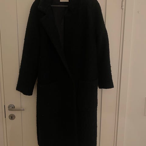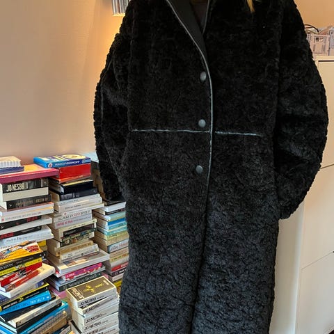 H&M kåpe i fuskepels for dame i størrelse M. Kåpen er svart og har en myk, strukturert overflate. Modellen har krage og lange ermer. Innsiden er glattfôret for økt komfort. Egnet som yttertøy i kjøligere vær.Jakken er ikke brukt men rivet av lapen