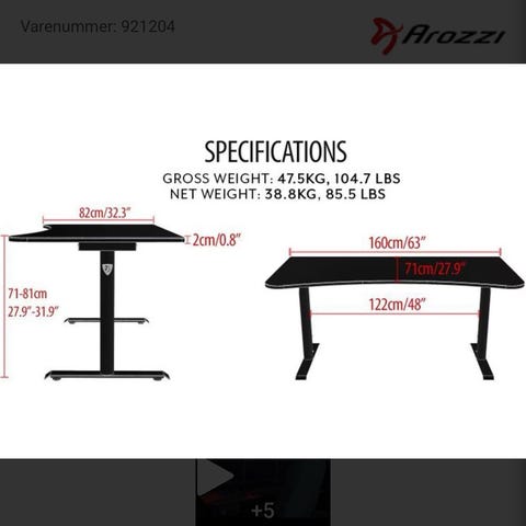 Maks vekt 145 kg, klasse 4 gassløfter, vinkeljustering 3D justerbare armlener