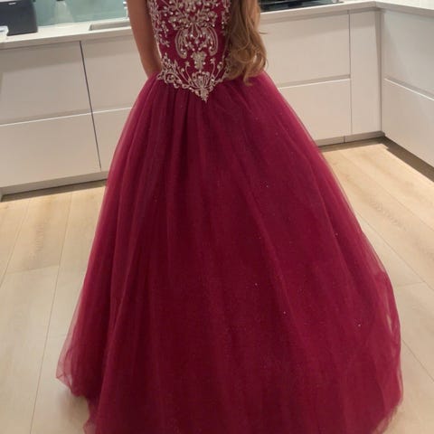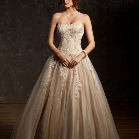 Nydelig ballkjole «Diin» fra Christiane brudesalong i Sandvika. Pent brukt. Passer fra høyde 155-165 cm. Har blanke stropper over skuldrene. Har snøring i ryggen slik at den kan strammes, tilpasses kroppen