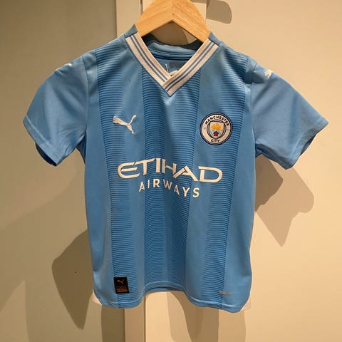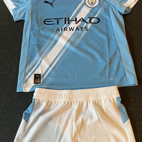 Pent brukt Man City Haaland drakt selges. Shorts str 5-6 og skjorte str 7-8, selges samlet. Strømper følger også med.