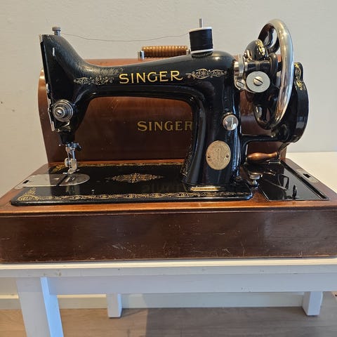 Singer symaskin i klassisk sort utførelse med gulldekor. Maskinen står montert på en trebase og leveres med tilhørende buet transportkasse i tre med bærehåndtak. Strømkabel og fotpedal følger med, og maskinen har mekaniske betjeningshjul og spoleholder på toppen. Egner seg til vanlig søm og enkle reparasjoner, samt som innrednings- eller samlerobjekt for den som ønsker en eldre, elektrisk Singer-modell. Må hentes på Skullerud.