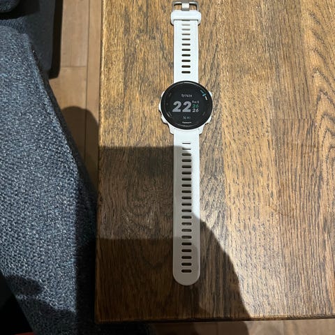 Garmin Forerunner 55 pulsklokke i svart. Klokken har rund skjerm og silikonreim med tradisjonell spenne. Modellen er utviklet for løping og annen trening, med funksjoner som treningsøkter, daglig aktivitetsmåling og varsler på skjermen. Passer til bruk i hverdagen og til ulike typer trening for både kvinner og menn.