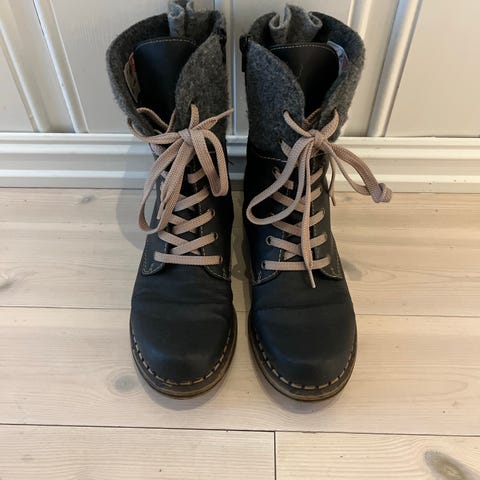 Rieker vinterstøvler i størrelse 38. Støvlene er i svart farge med høy hæl og grov såle. Overdelen er i glatt materiale med rynkedetaljer foran og strikket skaft øverst. Glidelås på innsiden av skaftet for enkel av- og påtaking. Fôret. Egnet som varme og stabile vinterstøvler til dame.