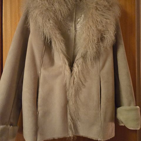 Vintage semsket kåpe med pels langs kanten!Tynt for! Belte og hemper for lukking! Står L/XL i kåpen,men jeg tenker den er en M/L