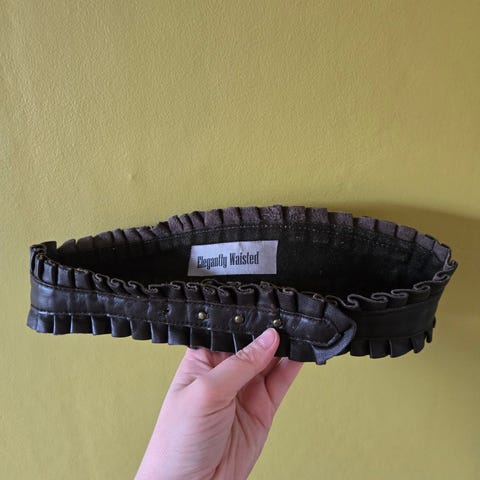 Bred modell med dekorative metallringer ved lukkingen. Passer til bruk i bukser, skjørt eller utenpå kjoler for å markere midjen. Materialet fremstår som imitert eller ekte skinn, men eksakt materiale er ikke oppgitt.