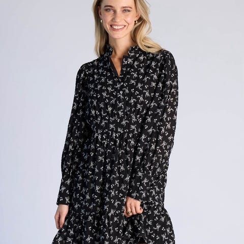 Dette er en kort, figurnær kjole med definert midje. Den har lange ermer med volum og fast mansjett, rund hals og en elegant nøkkelhullsdetalj med folder på brystet. En perfekt partykjole som også kan styles mer hverdagslig med loafers, boots og strikkegenser.