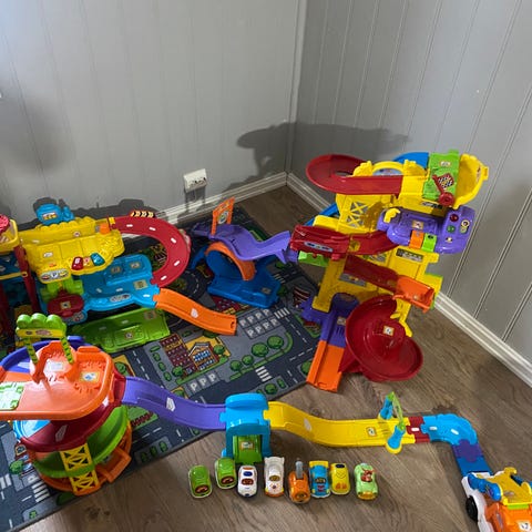 V tech bilbane lekesett i plast, bestående av flere sammenkoblede banedeler i ulike farger og høyder. Settet inkluderer rette og buede banestykker, ramper, svinger og ulike elementer som porter og små stasjoner. Det følger med flere små kjøretøy tilpasset banen. Delene kan bygges om og kombineres på ulike måter for å lage forskjellige baner. Egnet som aktivitetsleke for barn som liker biler og konstruksjon av enkle banesystemer.