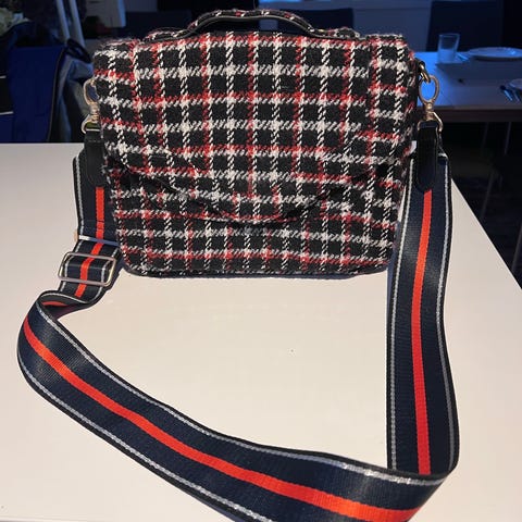 Vesken er pent brukt. Det finnes en liten flekk på baksiden, men den er ikke særlig synlig i bruk og påvirker ikke funksjonen. Glidelås fungerer som den skal.