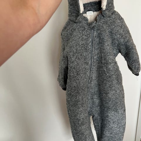 Lindex heldress i merinoull for barn, unisexmodell i størrelse 86. Fargen er beige. Heldressen har hette og lange ermer, samt hel glidelås foran for enkel av- og påkledning. Kommer fra røyk/ og dyrefritt hjem.