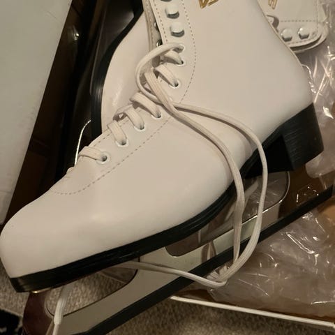 Kunstløpskøyter i størrelse 39. Klassiske hvite skøyter med høyt skaft og snøring foran. Egnet til kunstløp eller generell skøytebruk på isbaner. Skøytene har tradisjonell utforming med tagger foran på bladet for bedre fraspark på isen.