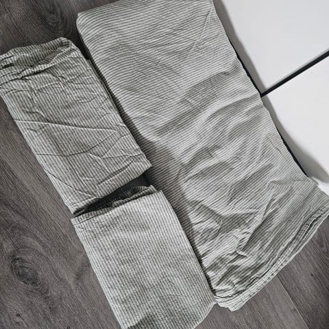 Helt og fint sengetøy fra Halvor Bakke. Usikker på stoff, men ser ut som en blanding av bomull og litt krepp.