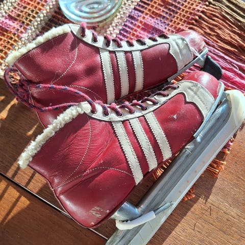 Gold skøyter i størrelse 42. Dette er et par eldre ABC Fabrikerna hockeyskøyter, sannsynligvis fra rundt 1960-tallet.