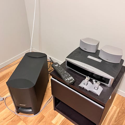 Følger med alt på bildene. Alle ledninger medfølger. Høyttalere i orden .