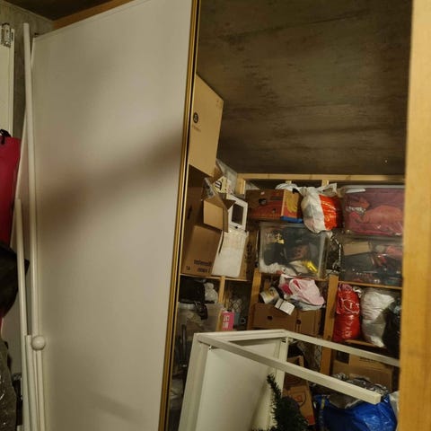 Garderoben er litt skadet. Side- og midtpanelene er intakte. Én dør er intakt ( 2 skyvedør - ett glass ett plate ) men ett hengsel er skadet. Noen skruer mangler, og baksiden av garderoben er skadet. Kanskje noen vil ha nytte av panelene. Den kan hentes.