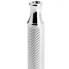 Leaf Shave Twig barberhøvel i metall, i blå utførelse. Dette er en enbladet sikkerhetshøvel med skrutopp der barberbladet festes mellom to plater. Håndtaket har riflet overflate for bedre grep. Høvelen kan brukes til barbering av ansikt og kropp, og passer til standard delte barberblader (double edge-blader som knekkes i to).