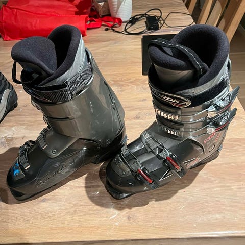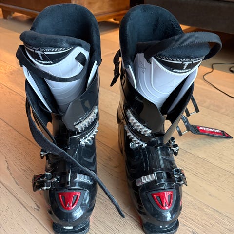 Atomic alpinstøvler i størrelse 22.0 cm (sålelengde ca. 267 mm). I følge søk på nettet tilsvarer dette omtrent EU 34. Støvlene har fire justerbare spenner i metall og kraftig stropp øverst for god tilpasning rundt leggen. Ytterskall i plast med kombinasjon av lilla front og hvit bakdel. Innvendig sort polstret liner for komfort og støtte. Såle med gummipartier for bedre feste ved gange. Egnet som alpinstøvler til barn.
