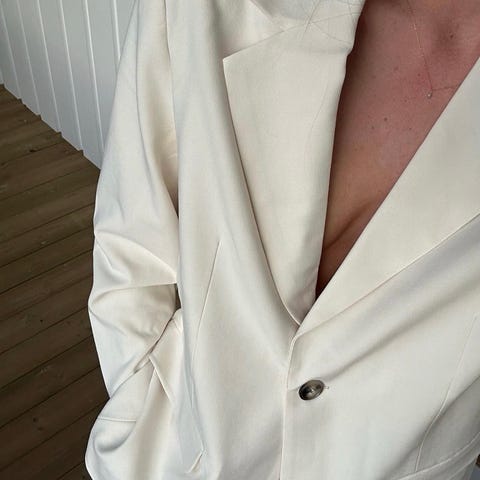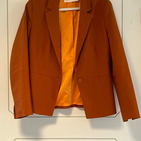 Klassisk og tidløs blazer fra InWear. Smal passform og feminint snitt. Frontlommer med klaff, splitt bak og god lengde. Lange ermer med dekorative knapper på mansjettene, jakken lukkes med en knapp i front. Dette er str 38.