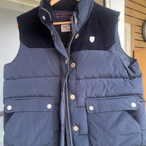 Jean Paul dunvest for dame i størrelse S. Vesten er blå med vattert dunfyll og høy krage. Den har knappelukking foran og flere utvendige lommer. Egnet som ytterplagg på kjølige dager eller som et ekstra isolerende lag over genser eller jakke.