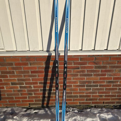 Madshus Lillehammer langrennski med Rottefella-bindinger i blå/hvite farger.