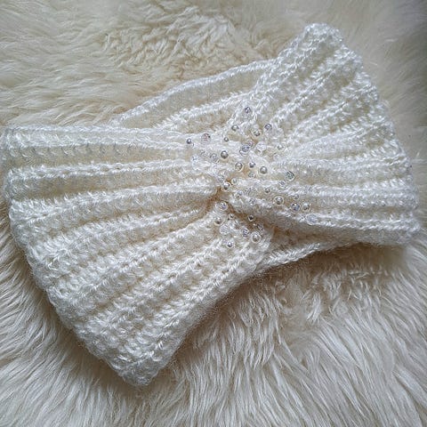 Heklet pannebånd av ull og brodert med perler. Lengde: ca. 24 cm.