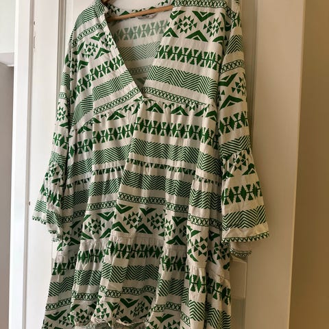 Mønstret kjole i fine blå/grønne toner Str. L.