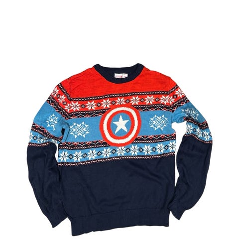 genser for herre i størrelse XXL. Genseren er blå og laget av bomull. Den har rund hals og ribbestrikkede kanter. På fremsiden er det et Super Mario Bros.-motiv med pikselgrafikk av Mario, mynter og snøkrystaller i et mønster som minner om en klassisk julegenser. Passer som hverdagsgenser eller temagenser ved anledninger der man ønsker et motiv fra Super Mario-serien.