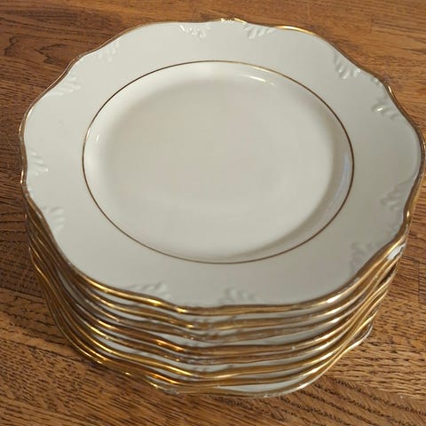 Elegant og tidløst design med bølget form, pregede detaljer og gullrand.