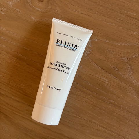 Elixir Niactil 4%. Litt under 1/3 brukt. Se bildet for hvor mye som er brukt, overgangen hvor det blir noe mørkere rett under skriften «cosmeceuticals». Kan få med tuben med litt face formula igjen om ønskelig.