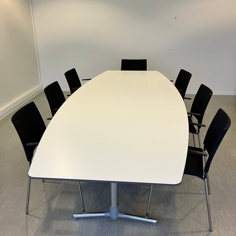 Pent brukt spisebord med 6 tilhørende stoler fra designmerket Rowoco 100.