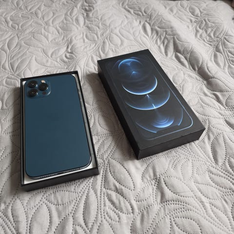Apple iPhone 12 Pro Max 128 gb og 85% batterikapasitet smarttelefon i blå farge. Modellen har tredobbelt kamera på baksiden og frontskjerm med Face ID. Telefonen leveres med original eske, USB‑C til Lightning‑kabel og dokumentasjon slik det vises på bildene. Egnet for bruk til daglige oppgaver, foto, video, sosiale medier og generell mobilbruk.
