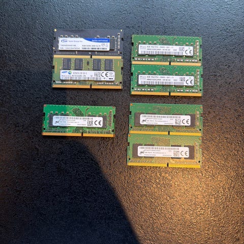 RAM SODIMM minnebrikker for bærbar PC. Standard DDR-minne i SODIMM‑format, egnet for bruk i kompatible bærbare datamaskiner eller små formfaktor‑systemer som støtter denne typen minne. Passer som oppgradering eller erstatning der tilsvarende SODIMM‑moduler brukes. Nøyaktig kapasitet og hastighet bør kontrolleres mot merking på brikkene eller tekniske spesifikasjoner før bruk.