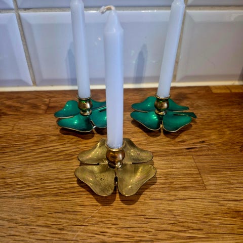 Lysestakene har diameter 8,5 og høyde 2,4 cm - passer til små stearinlys med diameter 12 og høyde 110 mm (selges bl.a. hos Clas Ohlson)