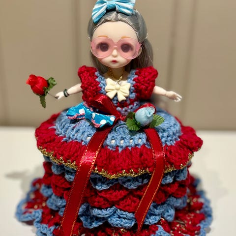 Søkeord: Håndlaget Retro Gammeldags Heklet Hekling Dukke Dokke Dorull Toalett Bad Pynt Håndarbeid Fargerikt Hjemmelaget Kjole Gaver
