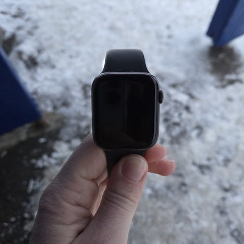 Apple Watch Series 4 (GPS)smartklokke med svart, gullt ring den sportsreim. Klokken har rektangulær berøringsskjerm og digital krone på siden for navigasjon. Baksiden har optiske sensorer for pulsmåling. Reimen er justerbar med flere hull og passer ulike håndleddsstørrelser. På bildene følger det også med en ladestasjon/holder som har plass for trådløs lading av telefon (Qi) og integrert plass for Apple Watch-lader. Klokken kan brukes til varsler, aktivitetsmåling, pulsmåling og tidsvisning når den er koblet til kompatibel iPhone.
