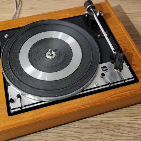 Fidelity 450P retro sen 70-tall / tidlig 80-talls platespiller med beltedrift. Modellen har manuell start og auto return-funksjon for tonearmen. Spilleren har støvlokk i plast og tallerken med gummimatte. Tilkobling skjer via analoge kabler (m/ DIN plugg). Klassisk S-tonearm, med anti-skate, og justerbart stifttrykk (lodd med innstilling for vekt). Utrustet med en morsom "kraftstasjon" av en pickup - ADC QLM 30 mk III (med hele 7,6 mV i output per kanal i 1 kHz), sferisk stift. Spilleren går i helt korrekt hastighet, noe treg i up/down mekanikk på tonearm (kan sikkert smøres), testet - spilte fint. Selges som den er. MÅ HENTES I TRONDHEIM.