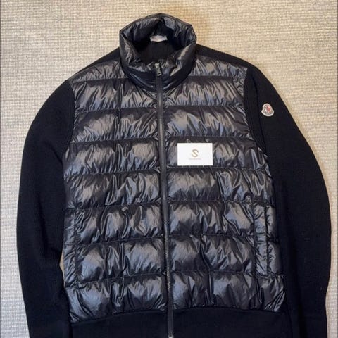 Fin moncler cardigan, men har vært sydd ved venstre lomme, og røket opphengsløkke.