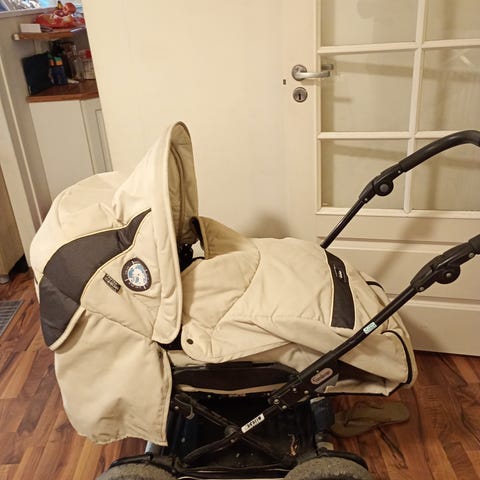 barnevogn i beige farge.