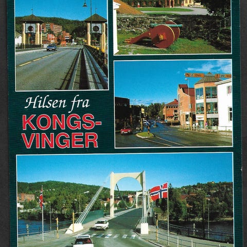 Postkort med motiv fra Kongsberg i Buskerud. Forsiden viser flere bilder fra byen, inkludert oversiktsbilde og bygninger. Strøkent, ubrukt storformat, se bilder