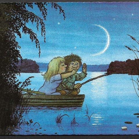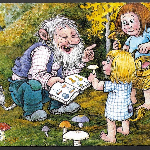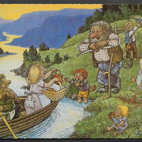 Trollrike postkort, etter tegninger av den svenske kunstneren Rolf Lidberg. Nr. 82 På Berget. Strøkent, ubrukt storformat, se bilder