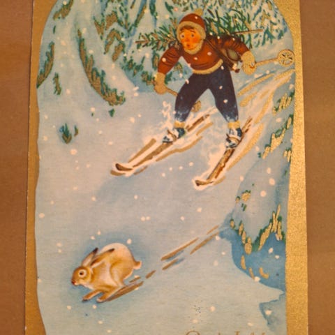 Postkort med illustrasjon av gutt som løper i vinterlandskap med hund som holder tak i postvesken hans. Fargelagt motiv med vinterbakgrunn og trær. Står Godt nytt år på forsiden, signert Erling Nielsen -44-. Ubrukt, pent småformat, se bilder