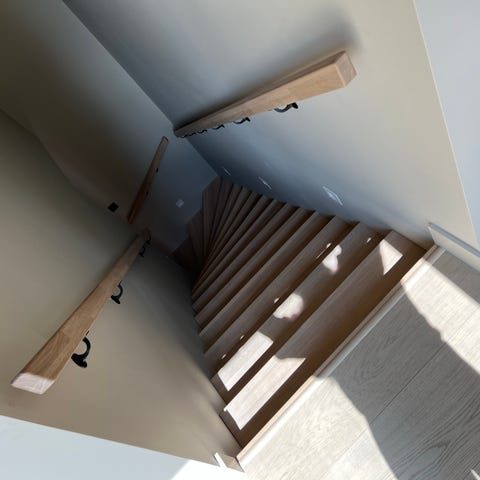 Trappegelender i eik med metallfester for montering på vegg. Gelenderet er rundt.