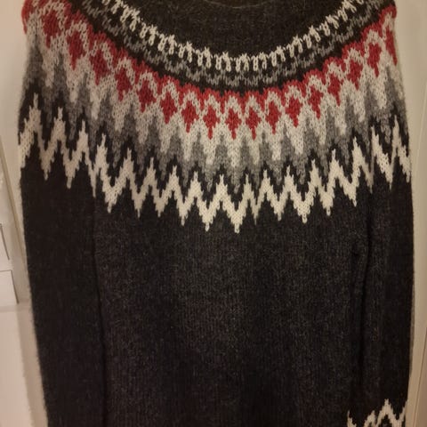Ble litt rart lys på ene stede på genser, men samme fine grå farge.