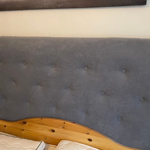 Meget pen sengegavl trukket med grått stoff selges kr. 500,-