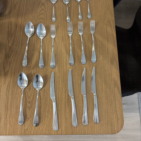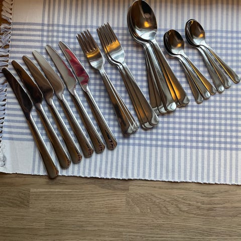 Har 6 kniver, 6 gafler, 4 skjeer og 2 teskjeer. De har bruksmerker/ riper etter normalt bruk. Pris per del eller samlet pris ved enighet.