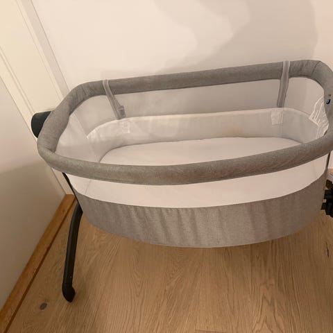 Moweo bedside crib babyseng i grå tekstil. Sengen er beregnet for spedbarn og kan plasseres tett inntil foreldreseng. Den har myke polstrede sider med nettingfelt for lufting og innsyn, samt madrass som følger med. Metallramme med stabile ben. Egnet som sidevognseng ved siden av vanlig seng for enkel tilgang til barnet om natten.
