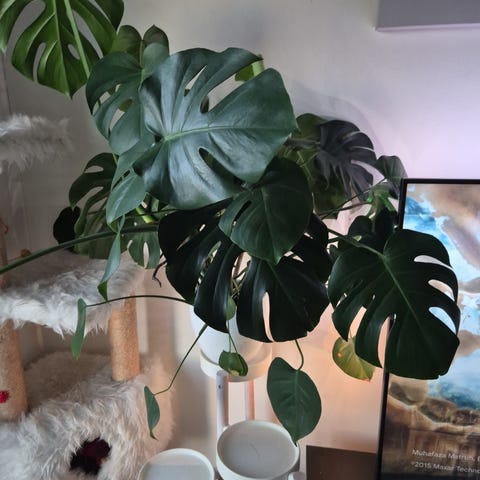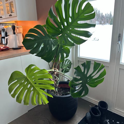 Monstera deliciosa potteplante i stor størrelse. Planten har store, grønne, flikete blader og står i potte med støttepinne. Egner seg som inneplante i stue eller andre rom med indirekte lys. Krever jevn vanning og trives i normal romtemperatur. Kjøpt i 2020, har siden da byttet potte annethvert år ca.